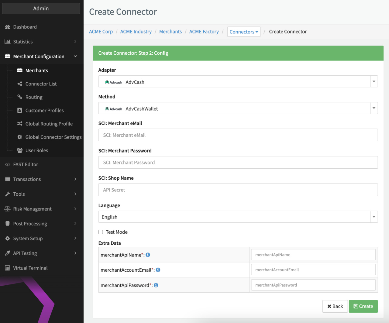 - Fill in the mandatory Extra Data: merchantApiName — API name in the Advanced Cash system