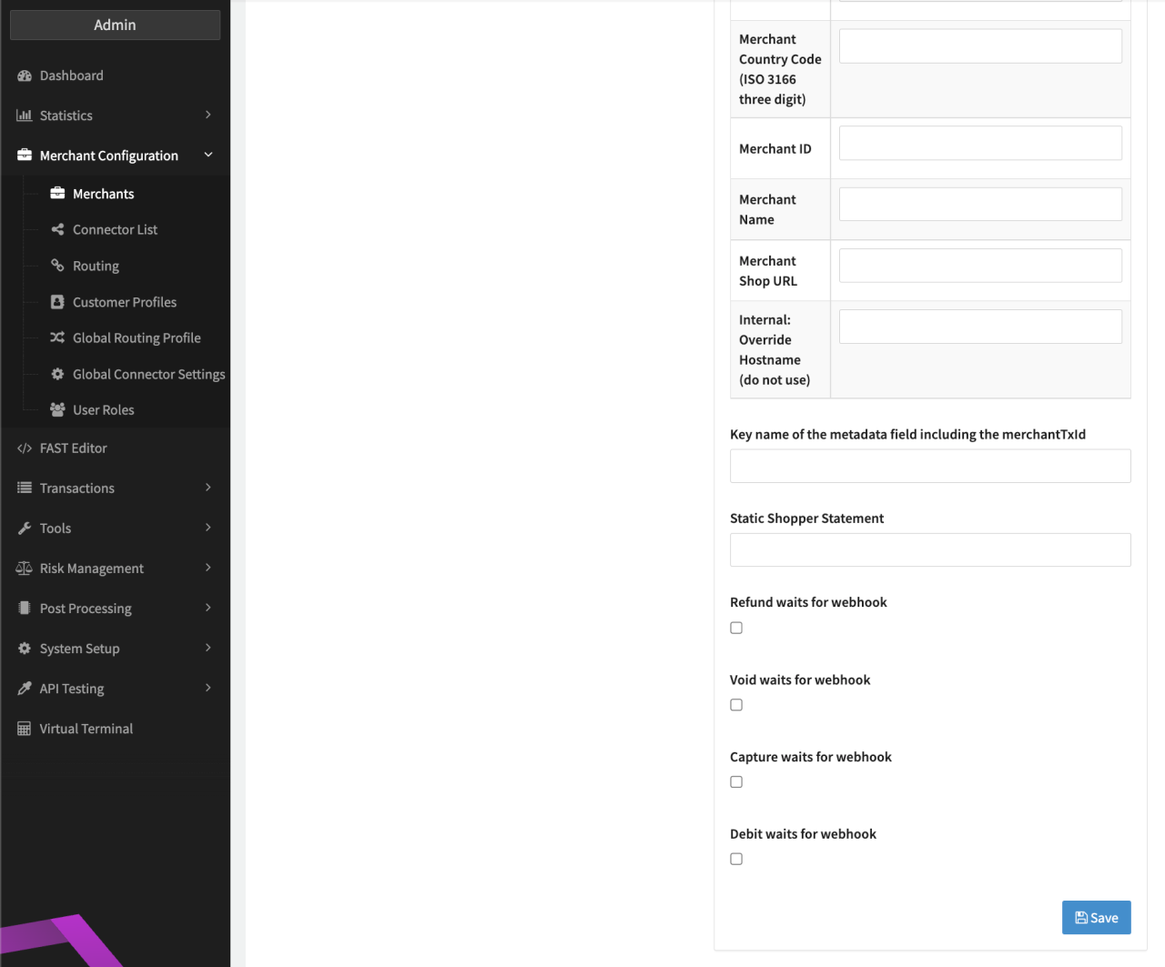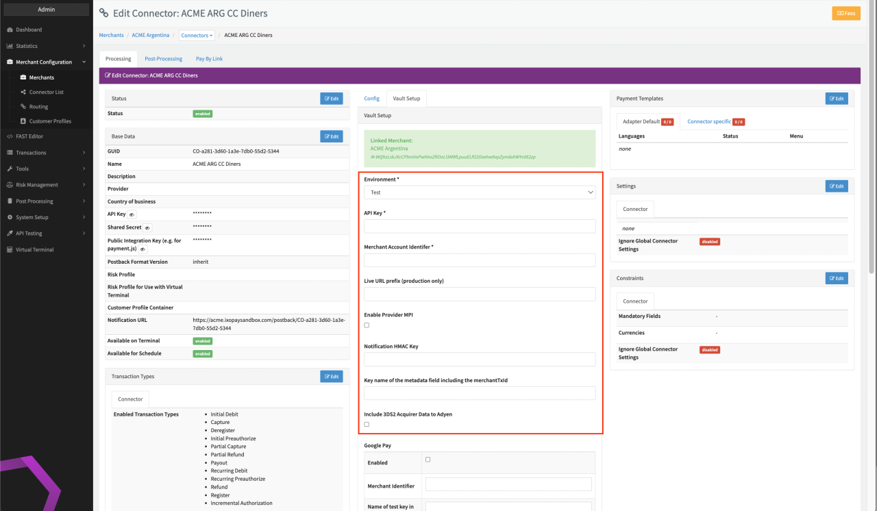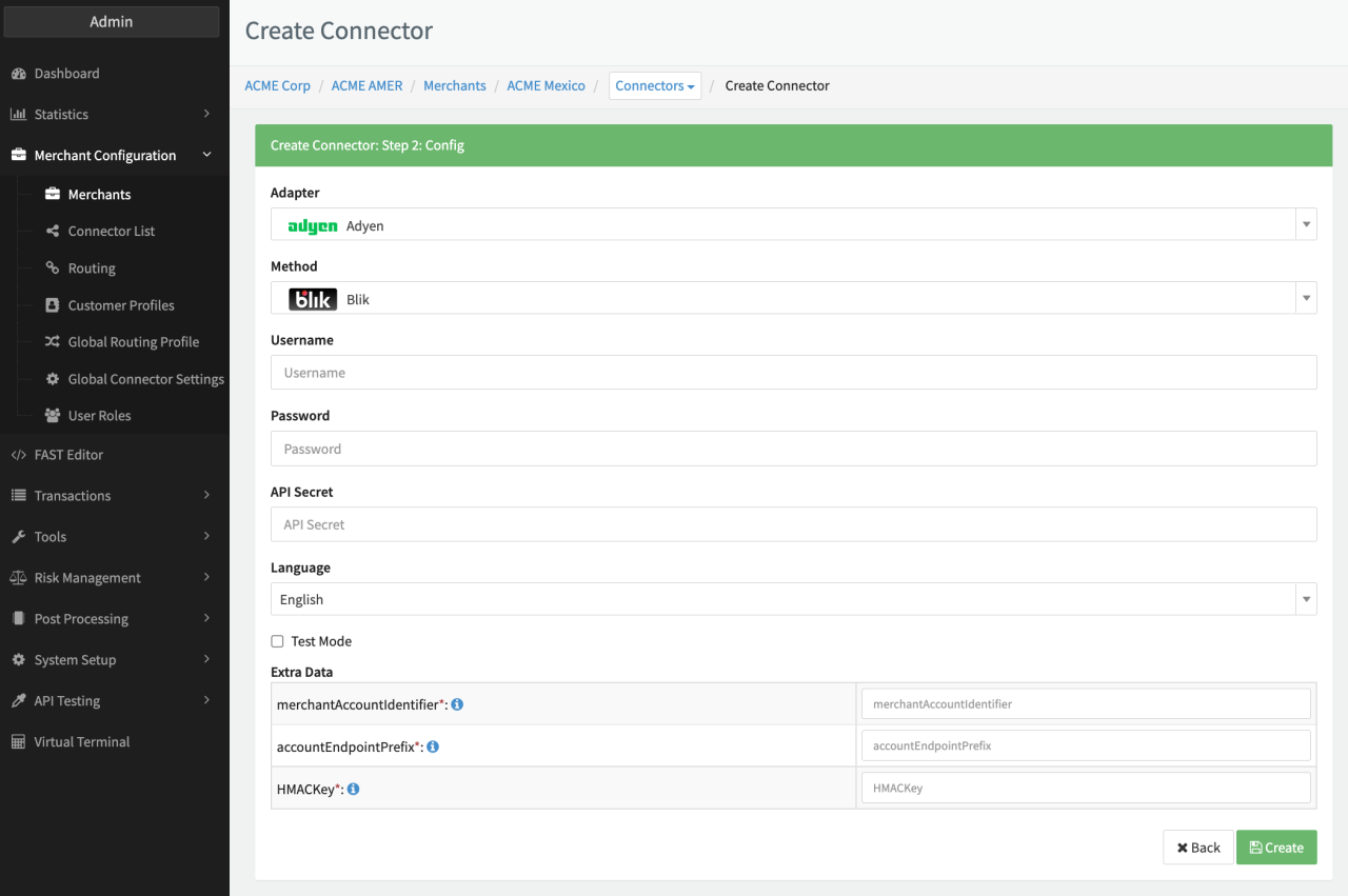 - Fill in the mandatory Extra Data: merchantAccountIdentifier