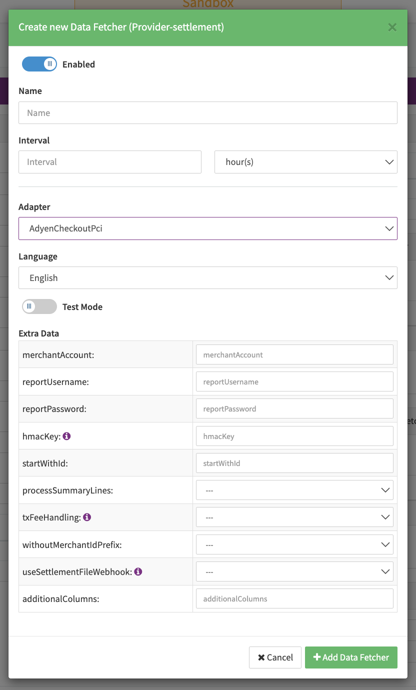 - Enable Testmode to test fetching of Provider Settlements from the Adyen Checkout PCI Sandbox
