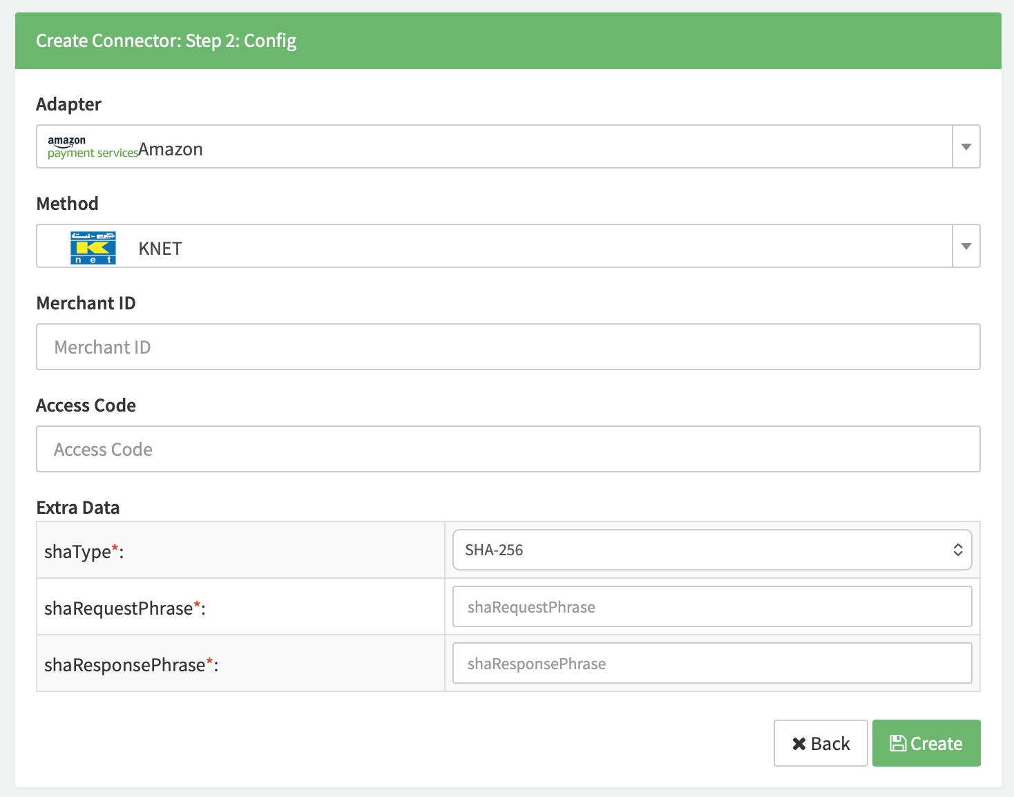 Depending on the chosen method a subset of the following parameters for the Connector needs to be configured. (see Connector Config - Amazon Payment Services)