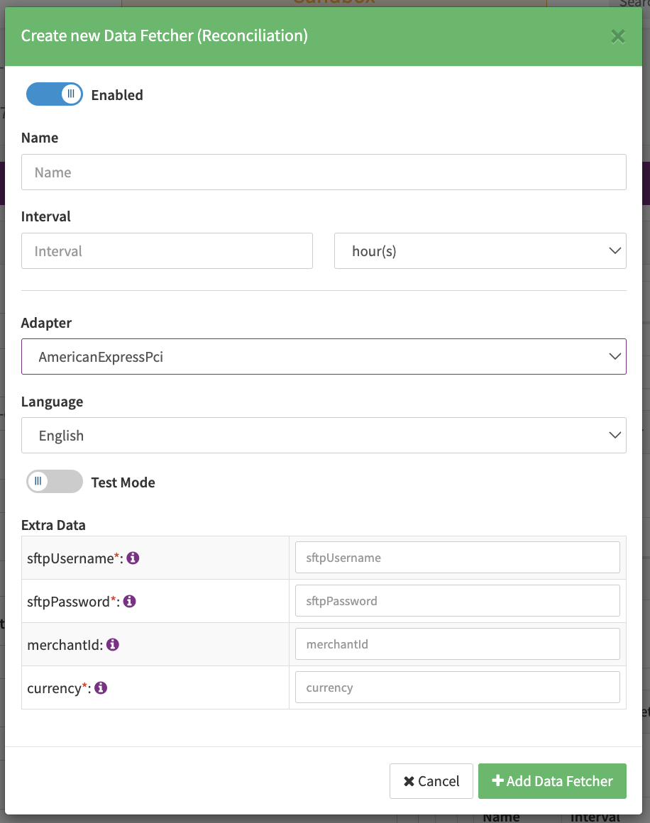 Configure the following Parameters for the Reconciliation Data Fetcher to fetch Reconciliation files (txt with filename contains EPPRC) via SFTP (fsgateway.aexp.com) (see Reconciliation Data Fetcher Provider Level):