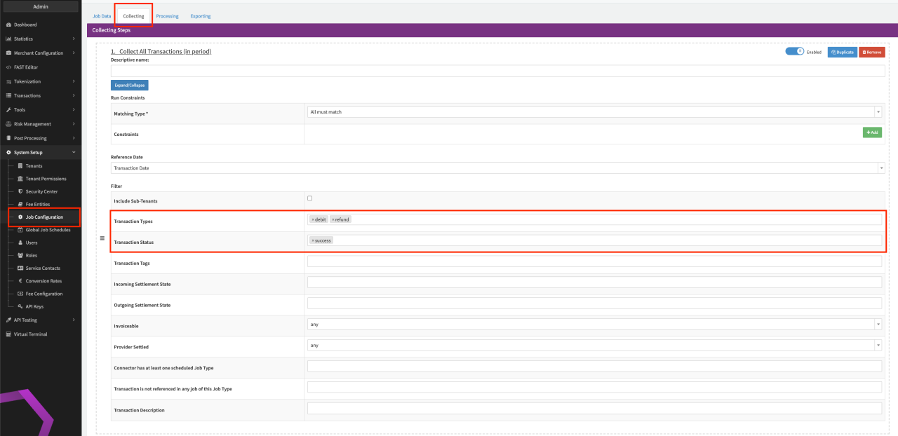 - n the Collect All Transactions (in period) option, filter the collecting step for Transaction Types "debit" and "refund" and Transaction Status "pending" (see Collecting Step).