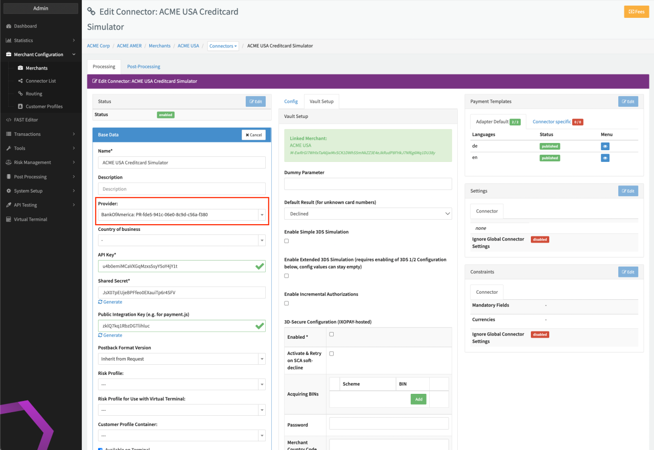 The Bank of America Adapter in the IXOPAY platform differs in its behavior from an ordinary Adapter. It does not directly communicate with any Bank of America provided Endpoint to process transactions. It is solely responsible for Transaction creation (and validation) in the IXOPAY platform, to be processed later on with an so called IXOPAY platform Provider (for more information have a look in the Post Processing section).