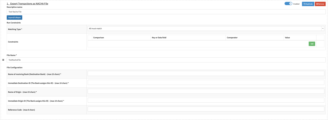 - Configure the Export Transactions as NACHA File option. The option requires the following parameter to be configured for the NACHA File Header: