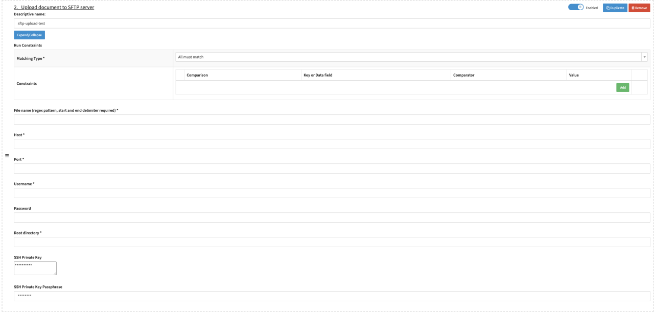 - Configure Upload document to SFTP server option. The option requires the following parameter to be configured: