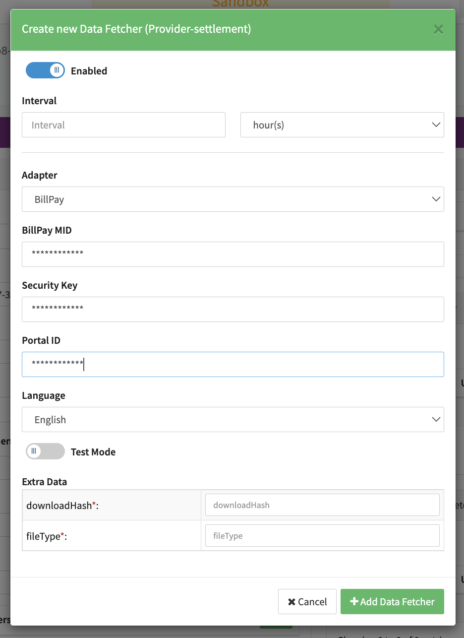 - Fill in the mandatory Extra Data: fileType here are different settlement files depending upon the country or payment method. BillPay will provide you the file types you will need upon request.