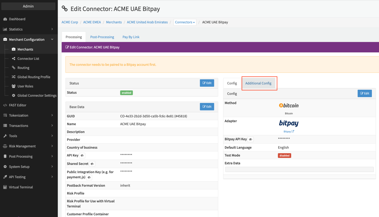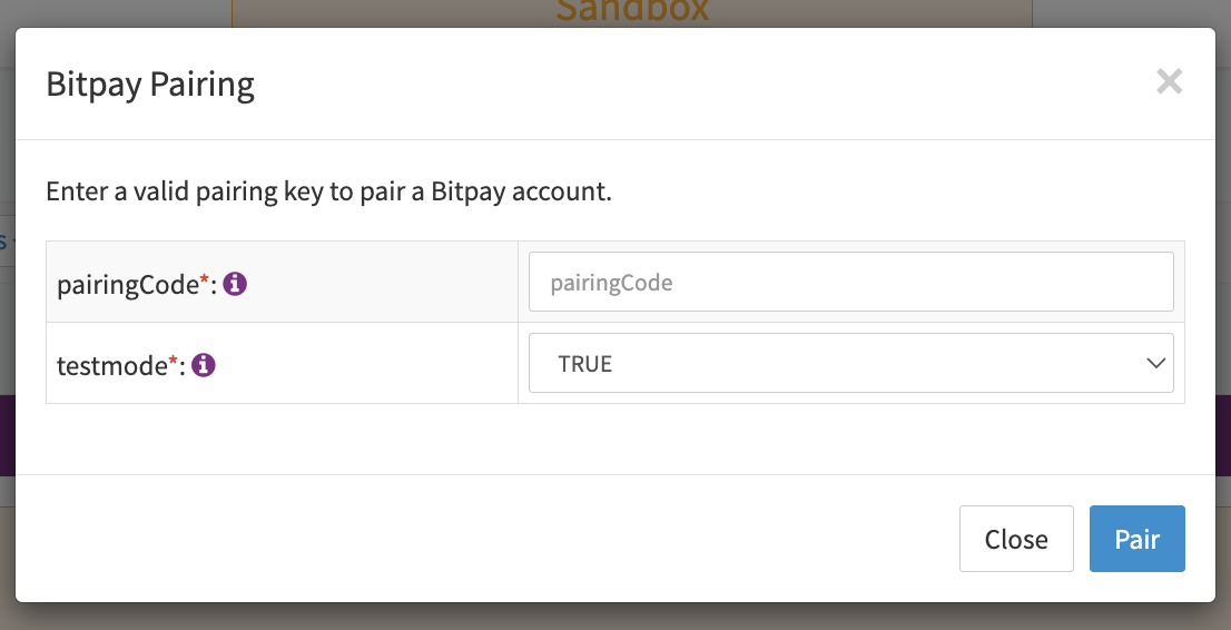 - Select Testmode true, false: false will pair the connector to the BitPay production environment.
