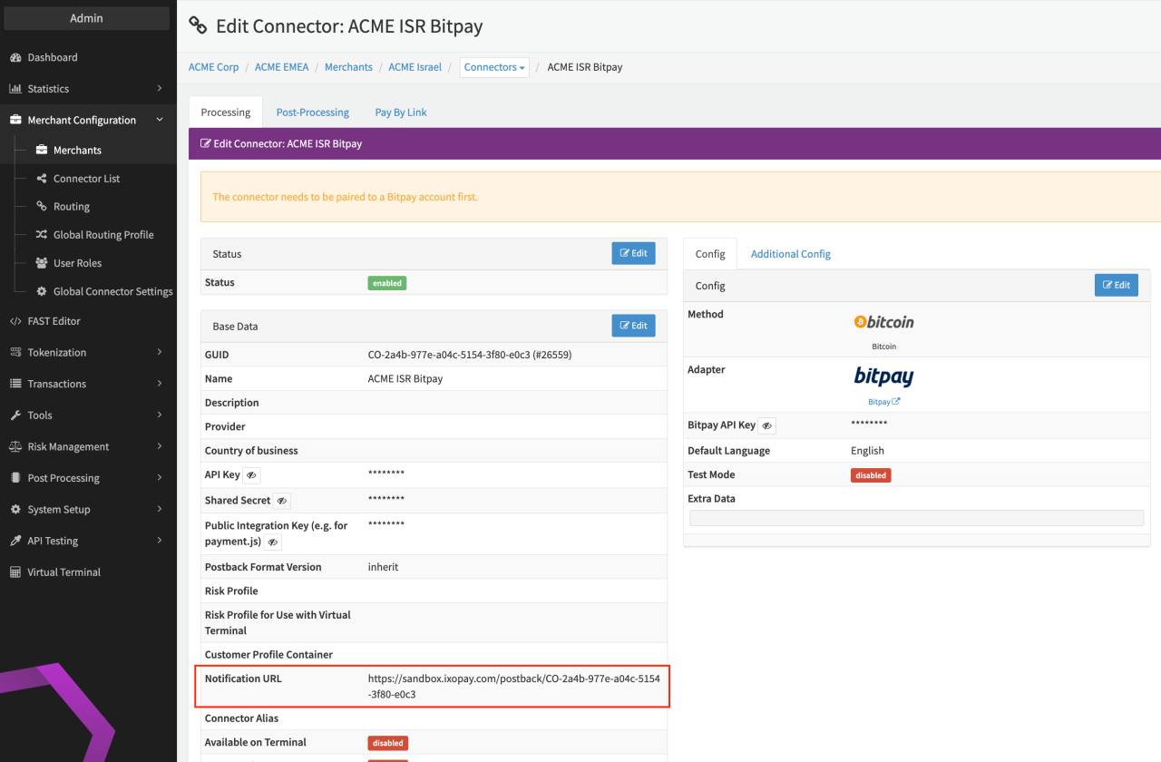 Follow these steps to pair your IXOPAY platform BitPay Connector: