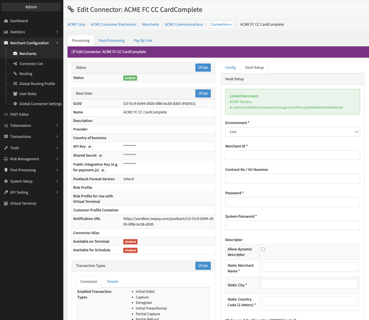 Configure the following parameters for the Connector (see Connector Detail Overview - Card Complete Creditcard - Vault Configuration):