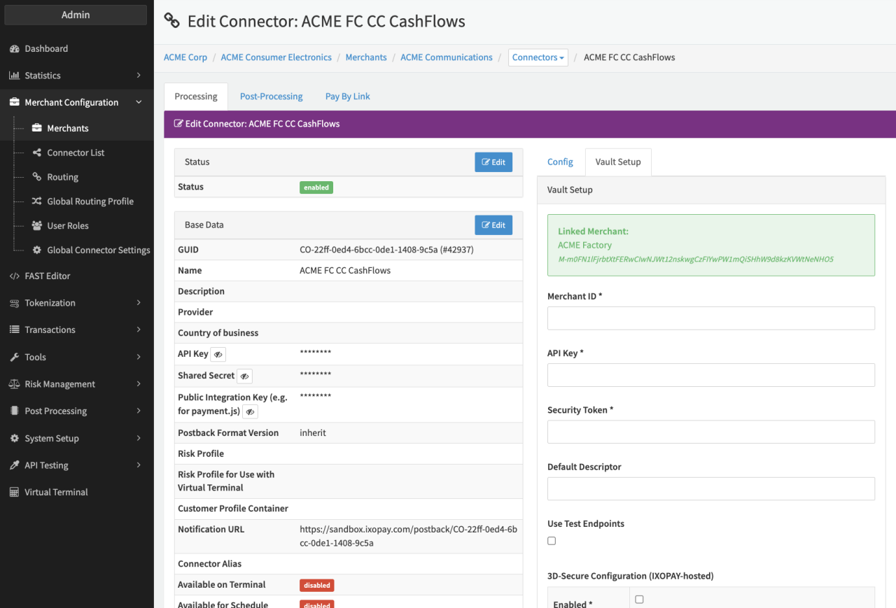Configure the following parameters for the Connector (see Connector Detail Overview - CashFlows Creditcard - Vault Configuration):