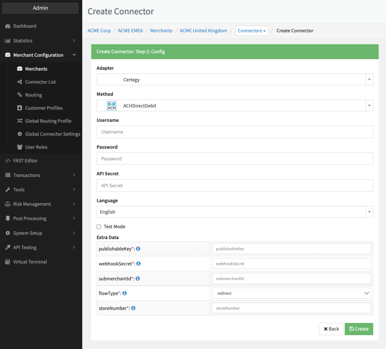 - Fill in the mandatory Extra Data: submerchantId