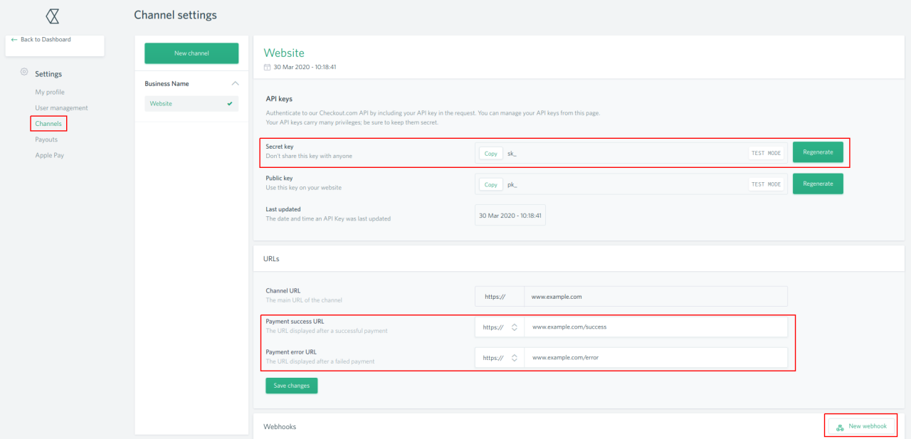The Secret Key is necessary to authorize the requests sent to Checkout.com. To retrieve the Secret Key, log into the Checkout.com Dashboard → Settings → Channels (see Checkout.com Dashboard).