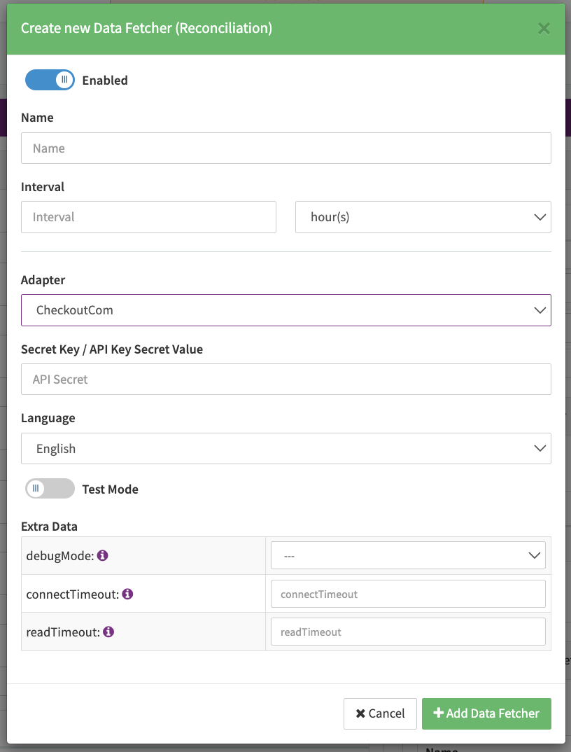- Fill in the Extra Data: connectTimeout (used for chargeback retrieval - if left empty the default value 60 will be used)