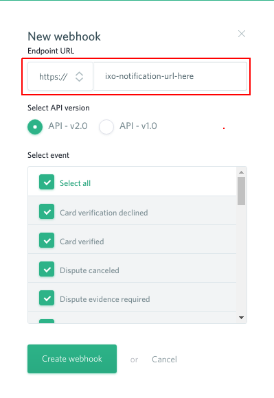 - As endpoint URL insert the Notification URL of the Connector (see Connector Detail Overview - CheckoutCom Creditcard - Vault Configuration)