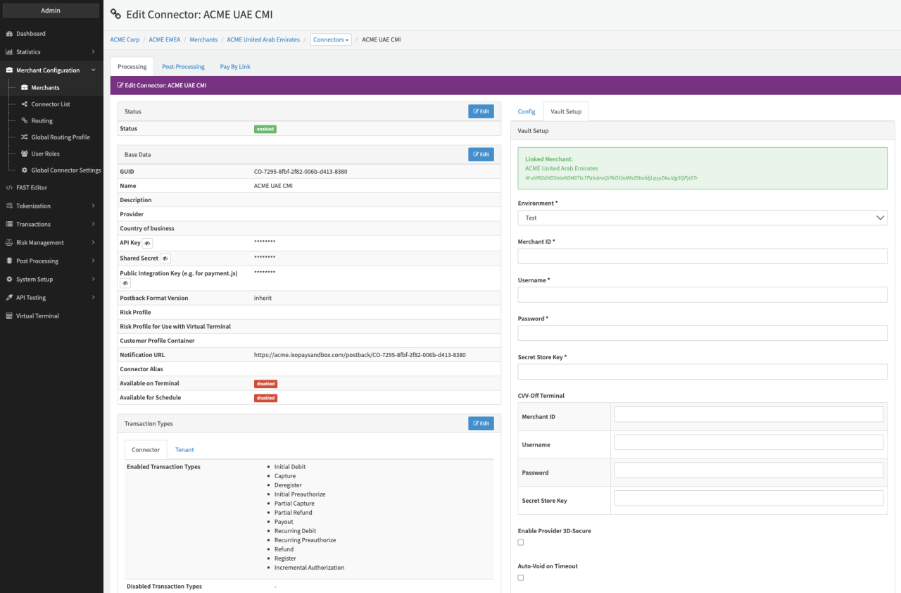 Configure the following parameters for the Connector (see Connector Detail Overview - CMI Creditcard - Vault Configuration):