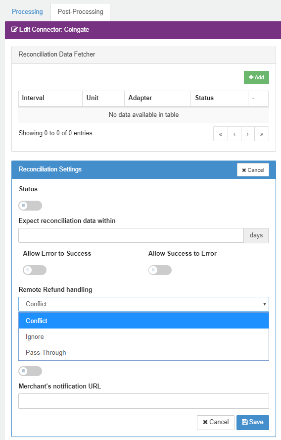 If a remote Refund notification from Coingate is sent to the IXOPAY platform, then as a default setting, the regarding Transaction is flagged as conflicted.