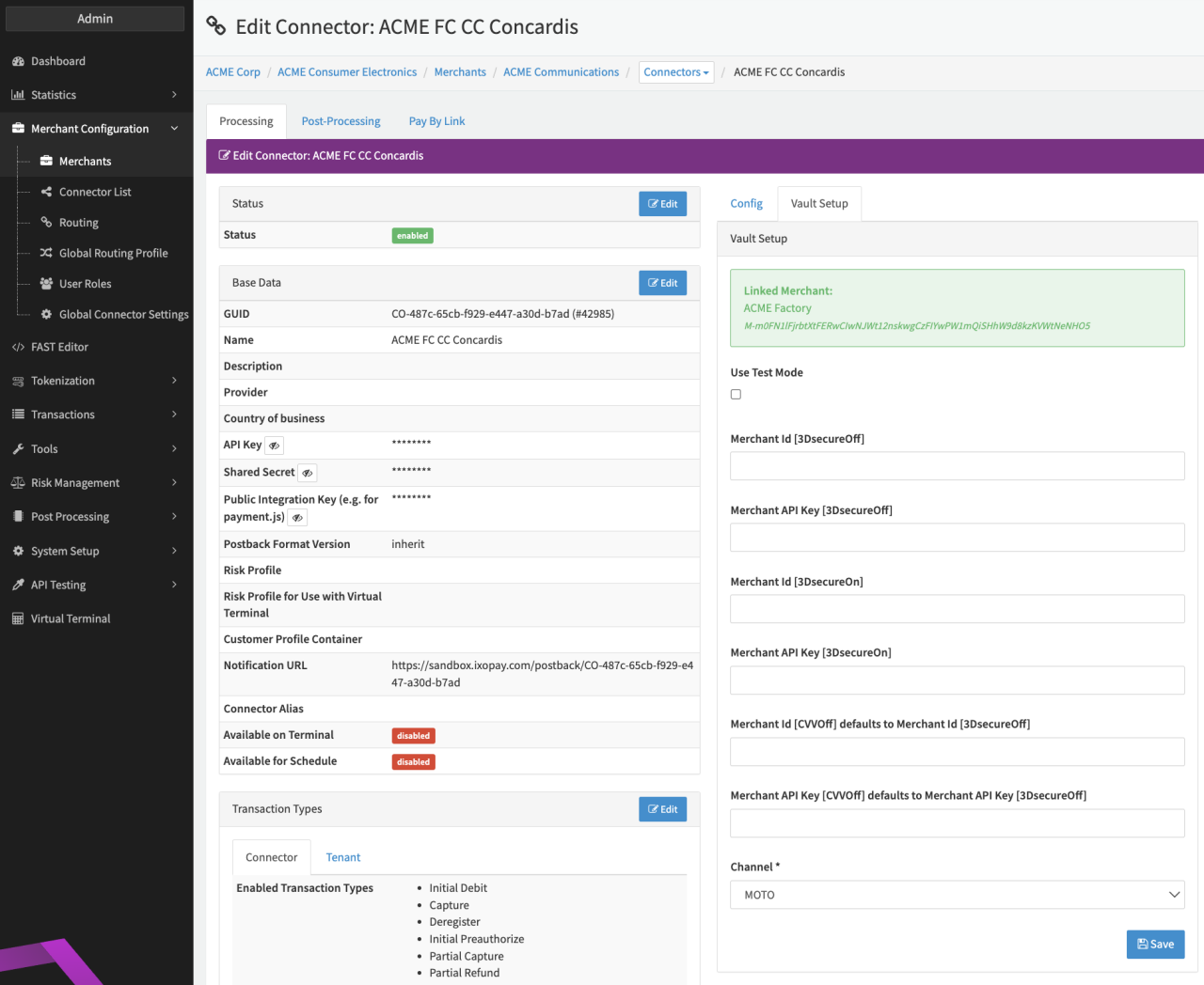 Configure the following parameters for the Connector (see Connector Detail Overview - Concardis Creditcard - Vault Configuration):