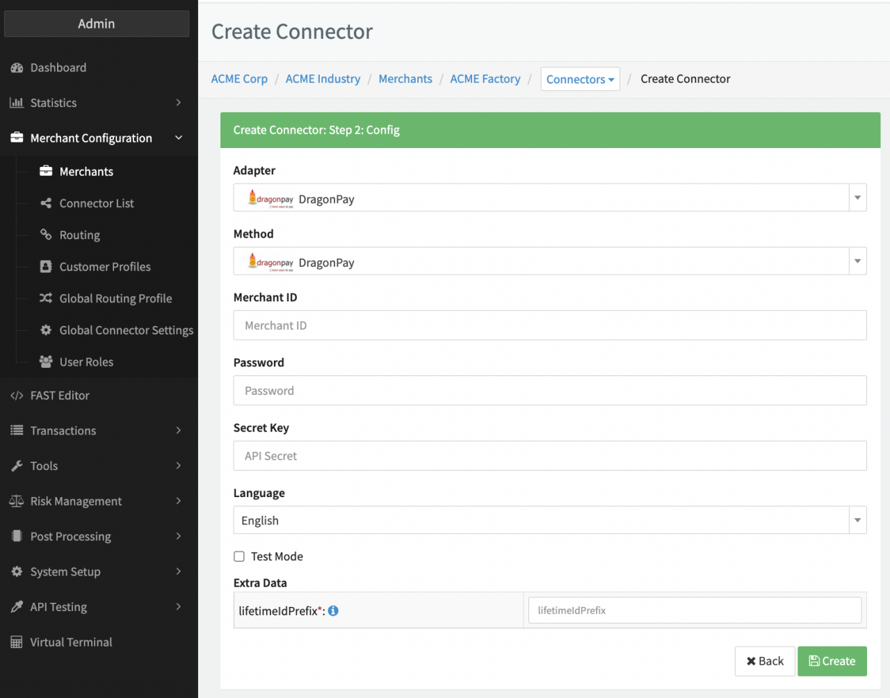 Configure the following parameters for the Connector (see Connector Config - DragonPay):