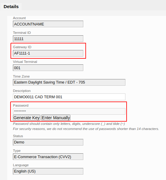 - Find the terminal details Gateway ID and the option to set the Password (Image 3)