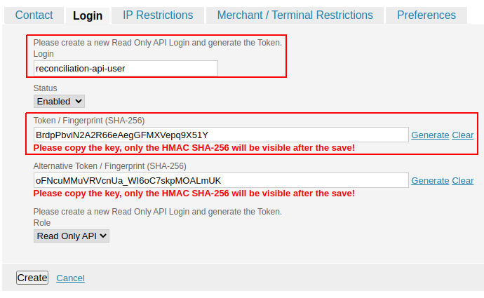 - The form will be updated and you can define the Login (username) and generate a Token (Token/Fingerprint (SHA-256)) (Image 9) - Make sure to copy the Login and Token to configure the Reconciliation Data Fetcher.