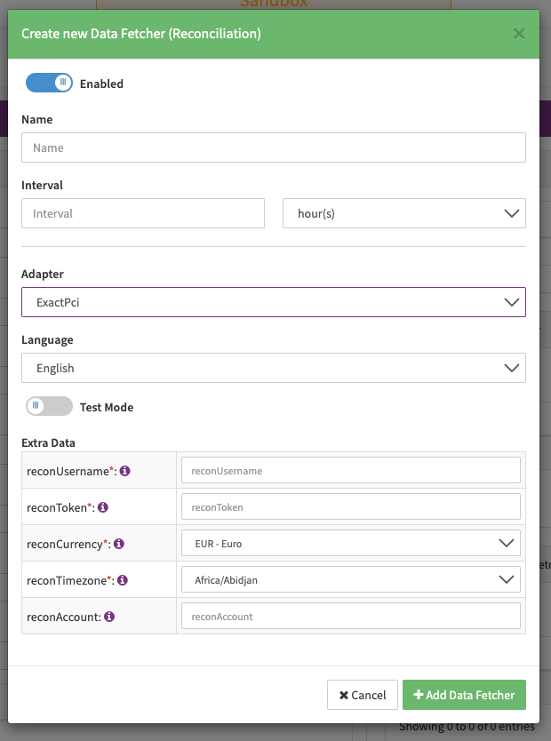 - Fill in the optional Extra Data: reconAccount - can be used to limit the Reconciliation to a certain Merchant Account ID provided by E-xact