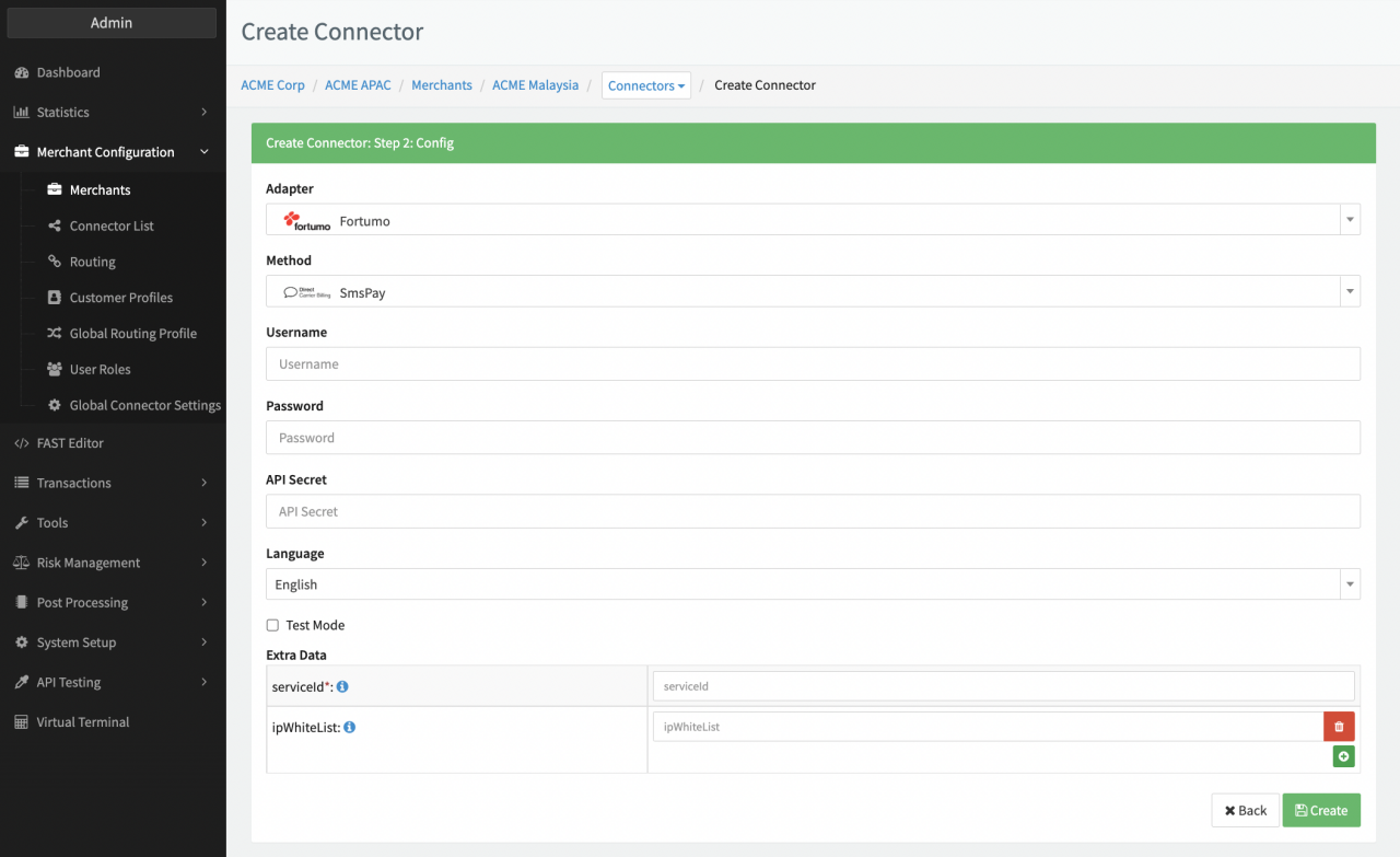 Configure the following parameters for the Connector (see Connector Config - Fortumo):