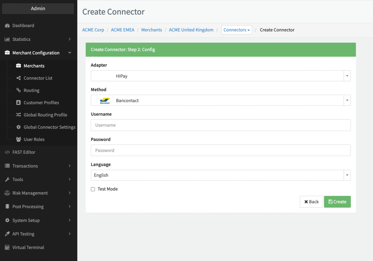 Configure the following parameters for the Connector (see Connector Config - Hipay):