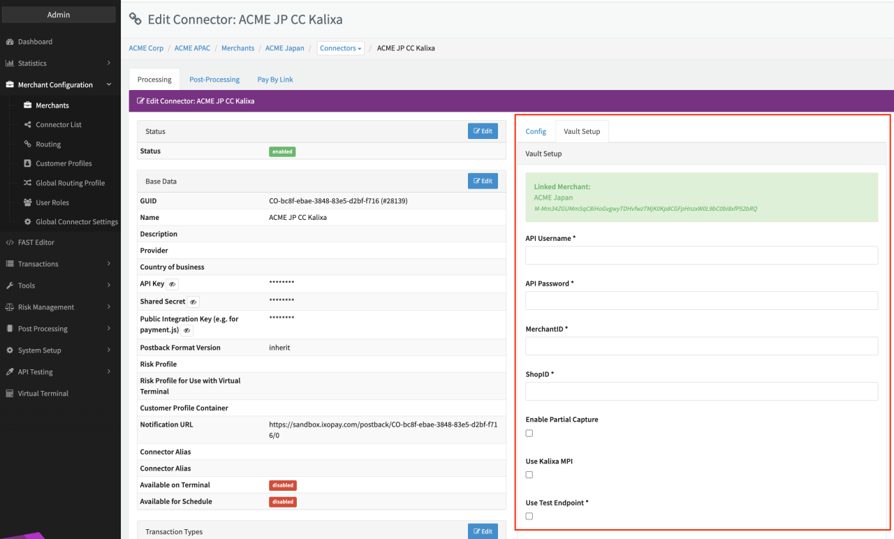 Configure the following parameters for the Connector (see Connector Detail Overview - Kalixa Creditcard - Vault Configuration):