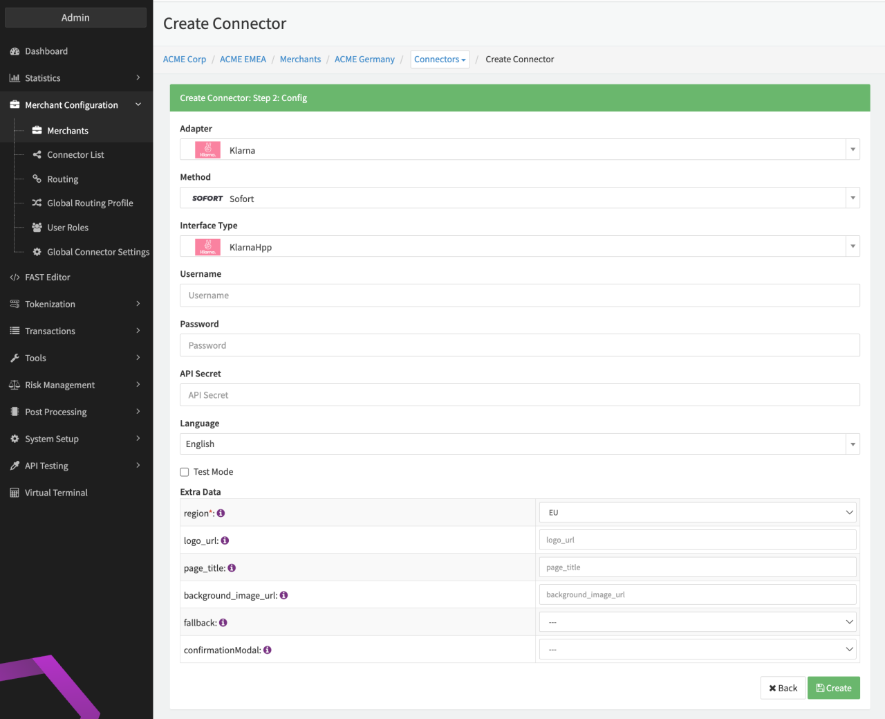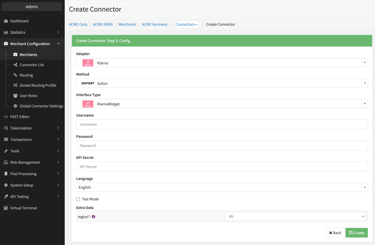 - Fill in the mandatory Extra Data: region - EU, NA, OC; region sets the base-url for the Klarna API