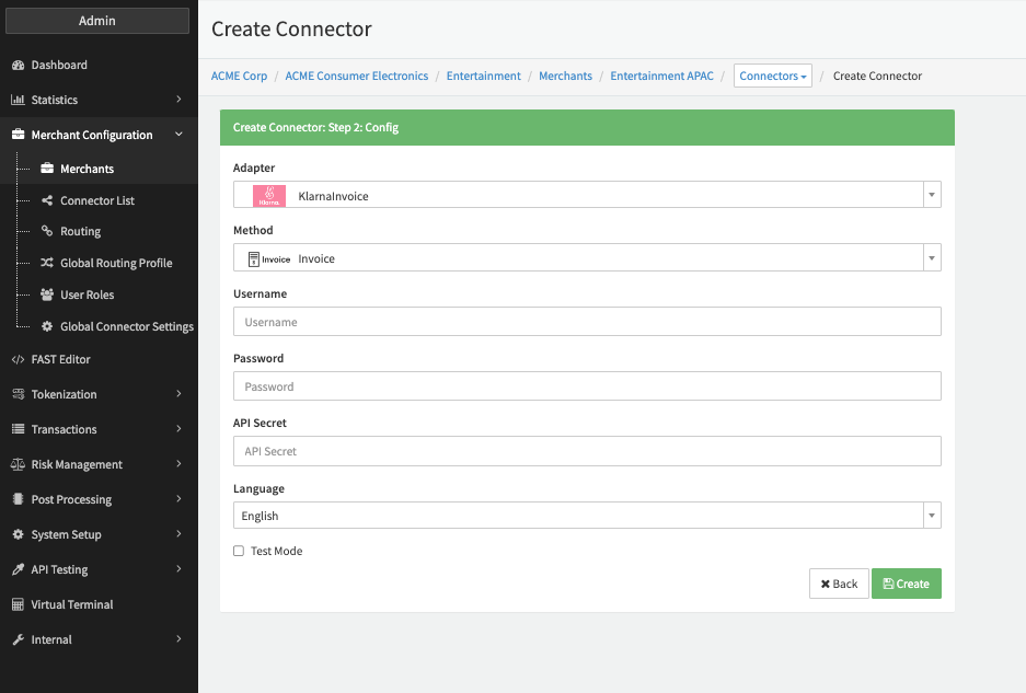 Configure the following parameters for the Connector (see Connector Config - KlarnaInvoice):