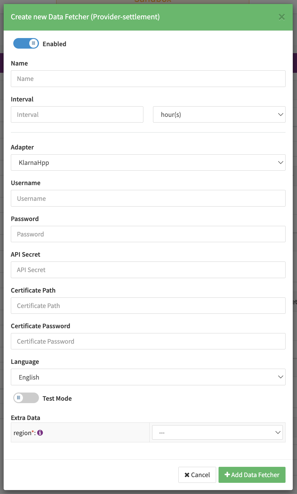 - Enable Testmode to test fetching of Provider Settlements from the Sandbox (Europe: https://api.playground.klarna.com/; North America: https://api-na.playground.klarna.com/; Oceania: https://api-oc.playground.klarna.com/), disabled the Production environments are used