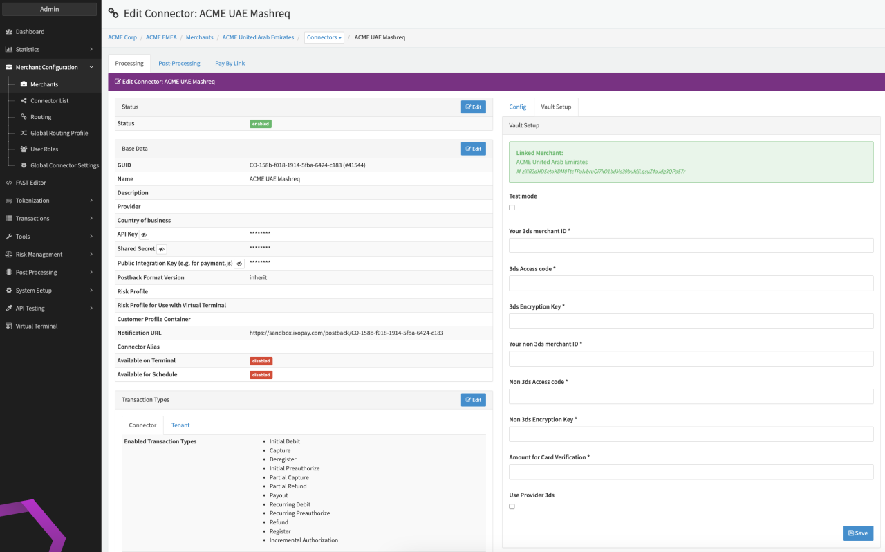 Configure the following parameters for the Connector (see Connector Detail Overview - Mashreq Creditcard - Vault Configuration):