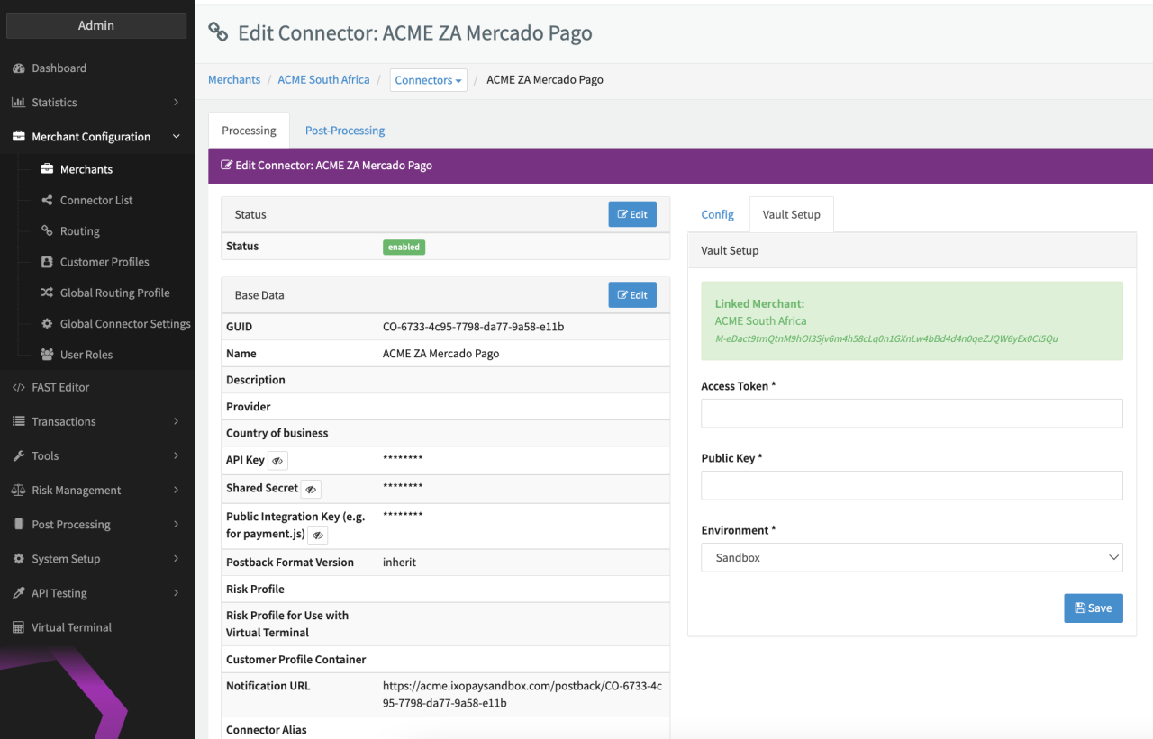 Configure the following parameters for the Connector (see Connector Detail Overview - Mercado Pago - Vault Configuration):