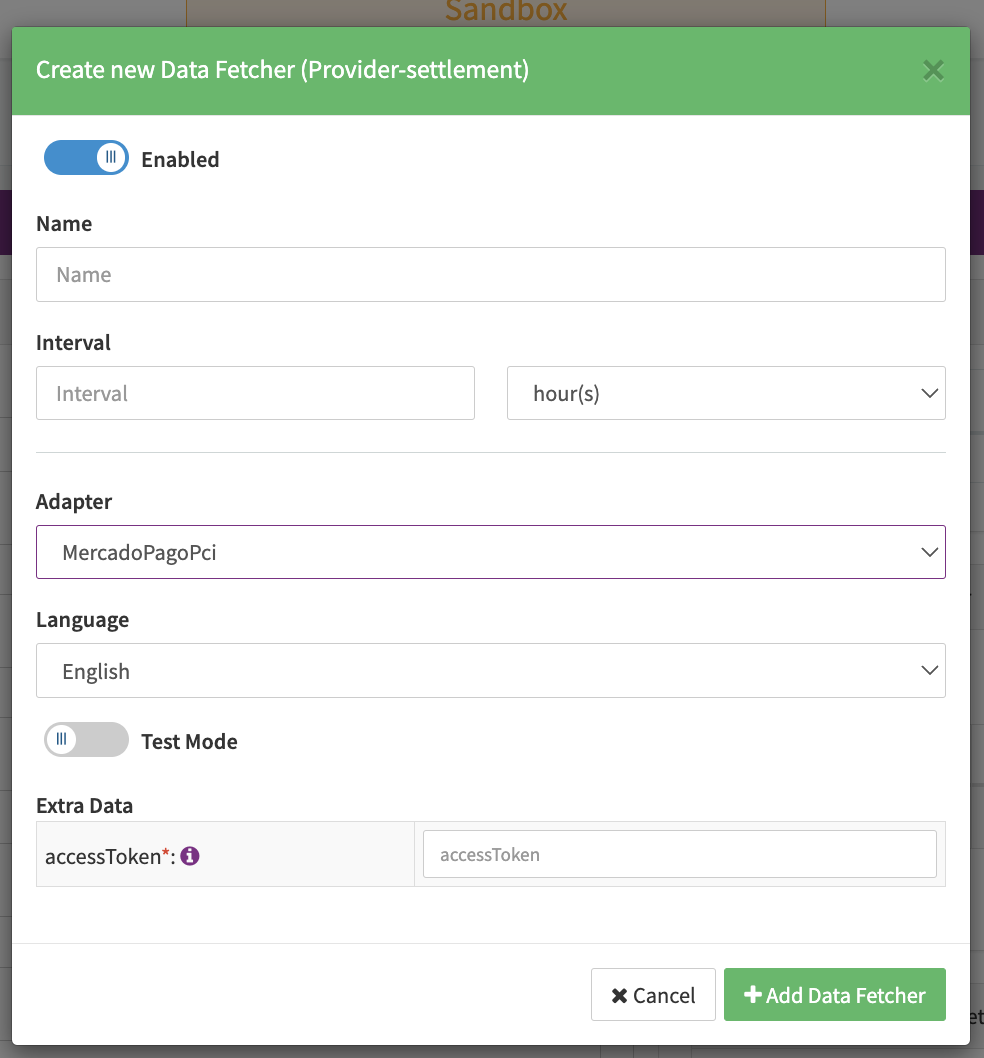 - Fill in the mandatory Extra Data: accessToken provided by MercadoPago