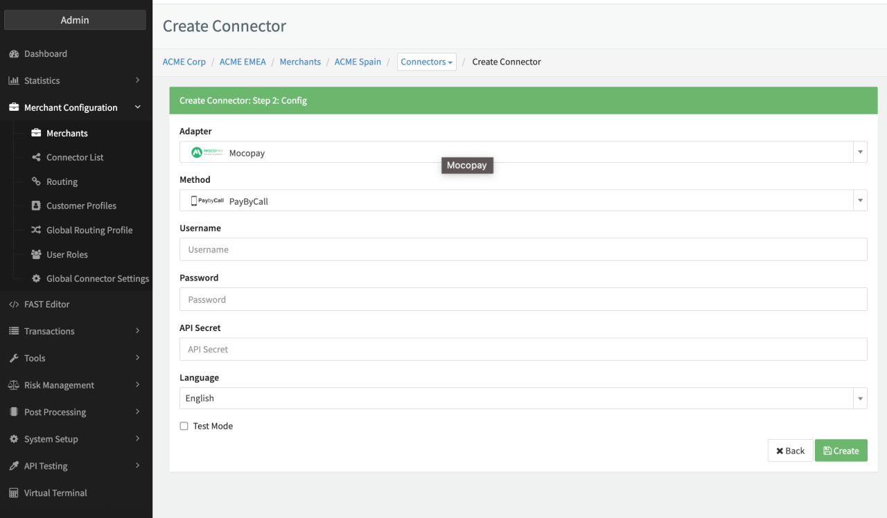 Configure the following parameters for the Connector (see Connector Config - Mocopay):