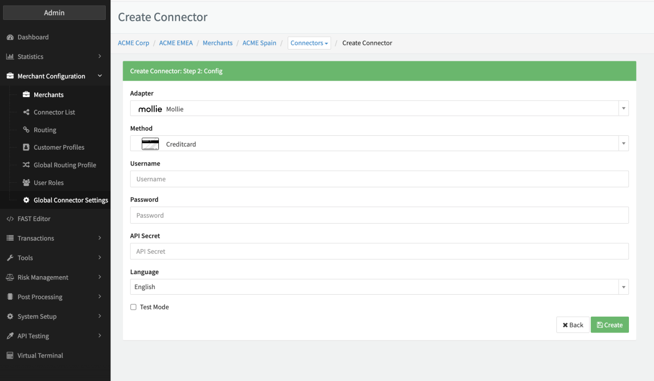 Configure the following parameters for the Connector (see Connector Config - Mollie):