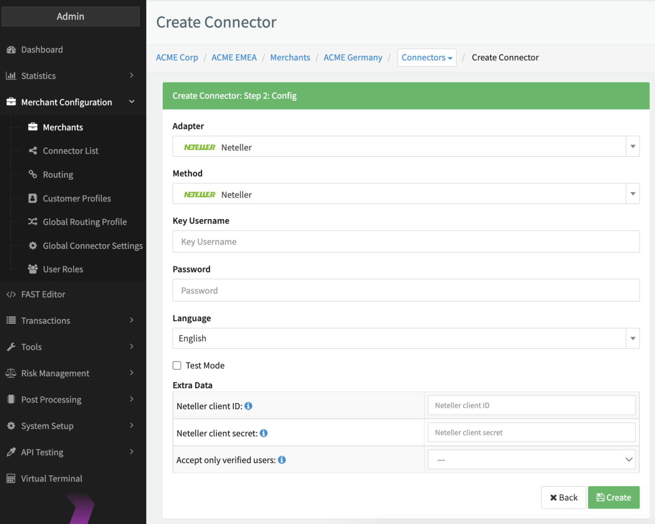- Fill in the optional Extra Data: Neteller client secret — for Customer details verification