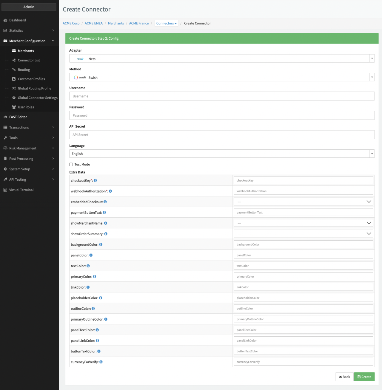 - Fill in the mandatory Extra Data: checkoutKey