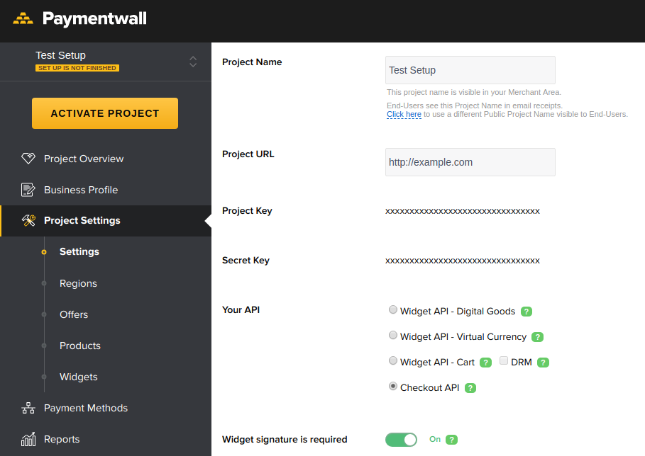 The IXOPAY platform uses Paymentwall's "Checkout API". Before using the Checkout API, you'll have to configure your project in Paymentwall's backend.