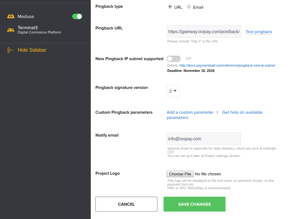 Additionally, you should setup the Pingback URL for receiving Chargebacks. You only need to set the Pingback type to URL, copy your Connector's notification URL into the Pingback URL field and select version 3 for Pingback signature version (see Image 3).