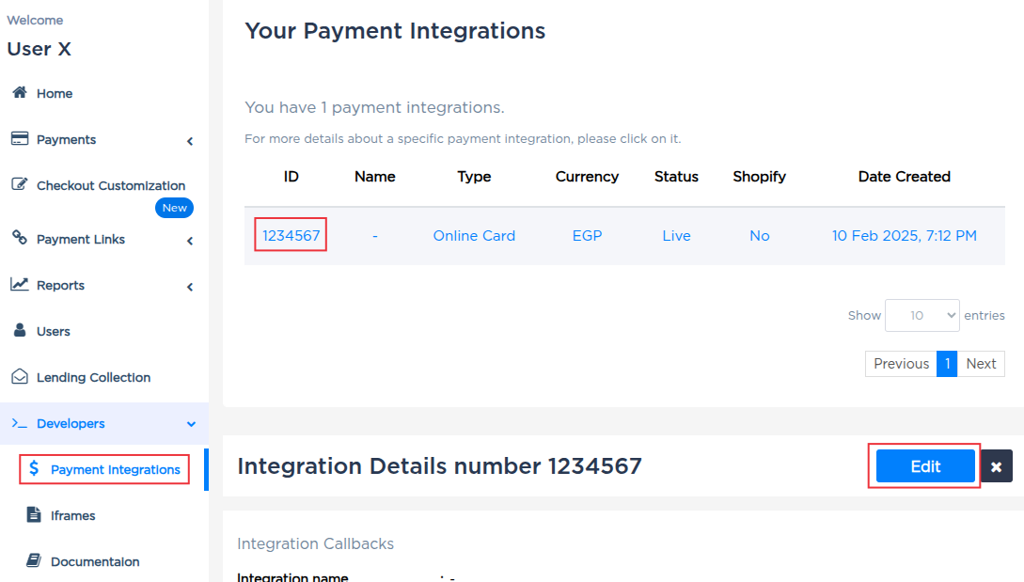 Paymob Dashboard > Developers > Payment Integrations