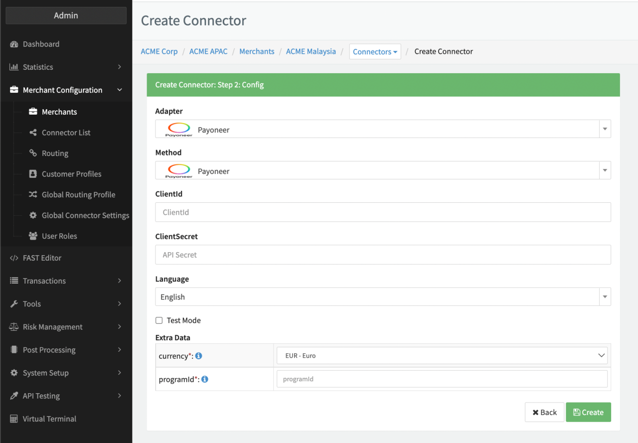 Configure the following parameters for the Connector (see Connector Config - Payoneer):