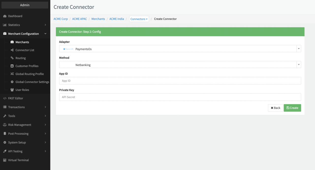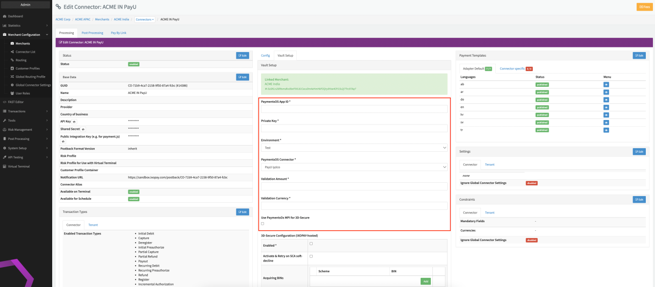 - Select the PaymentOS Connector: PayU Iyzico, PayU India, PayU Mexico, PayU Brazil, PayU Russia, PayU South Africa, PayU Columbia