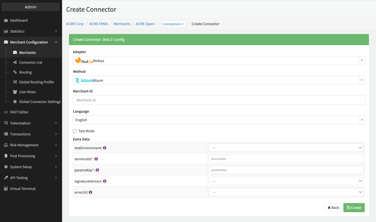 - Fill in the mandatory Merchant Id (see also https://pagosonline.redsys.es/entornosPruebas.html Merchant Code)