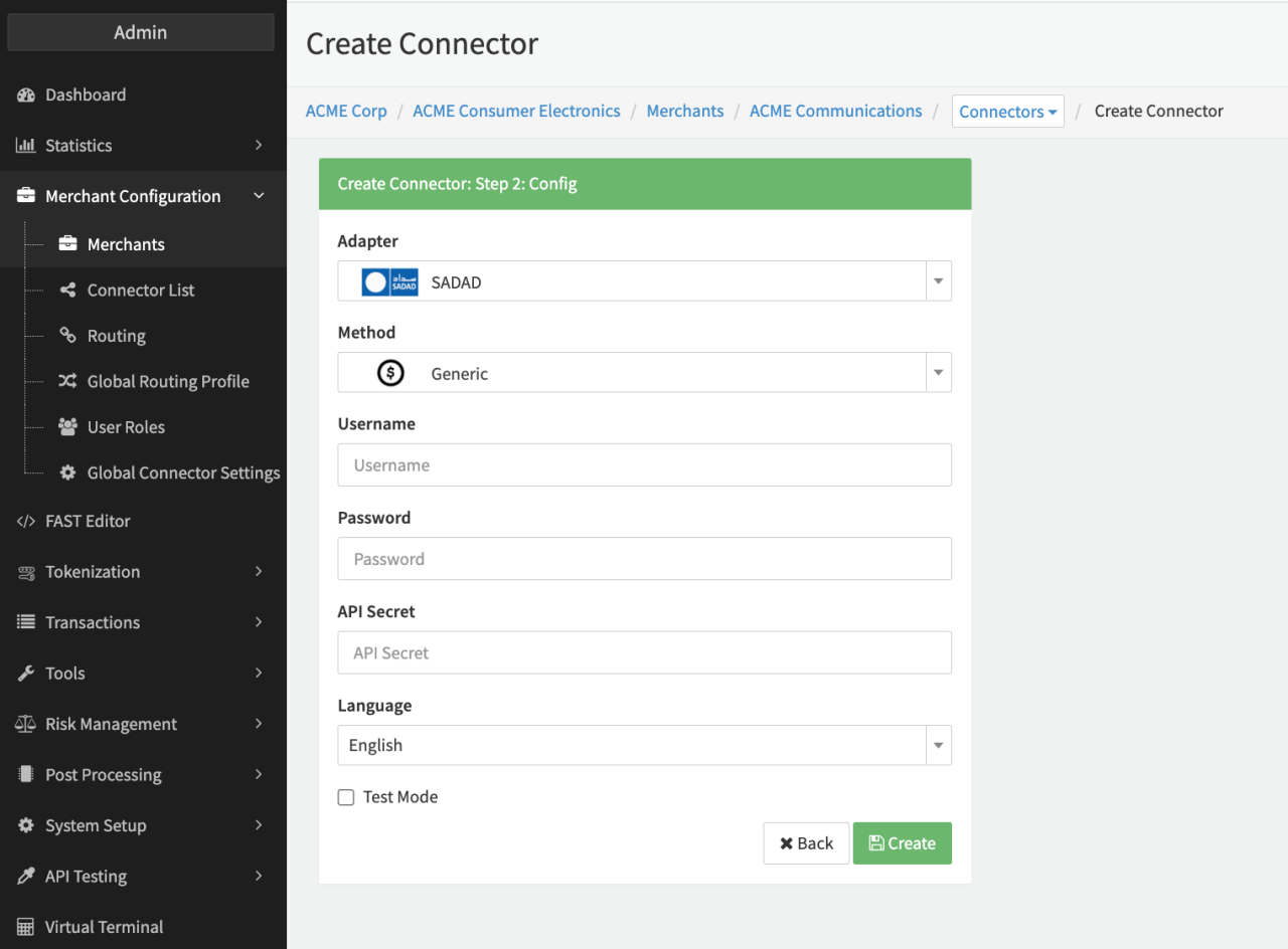 Configure the following parameters for the Connector (see Connector Config - SADAD):