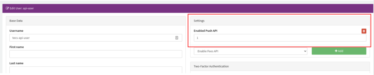 As a special case, grant the API User the permission for the Push API by setting "Enabled Push API to 1" (Image 1)