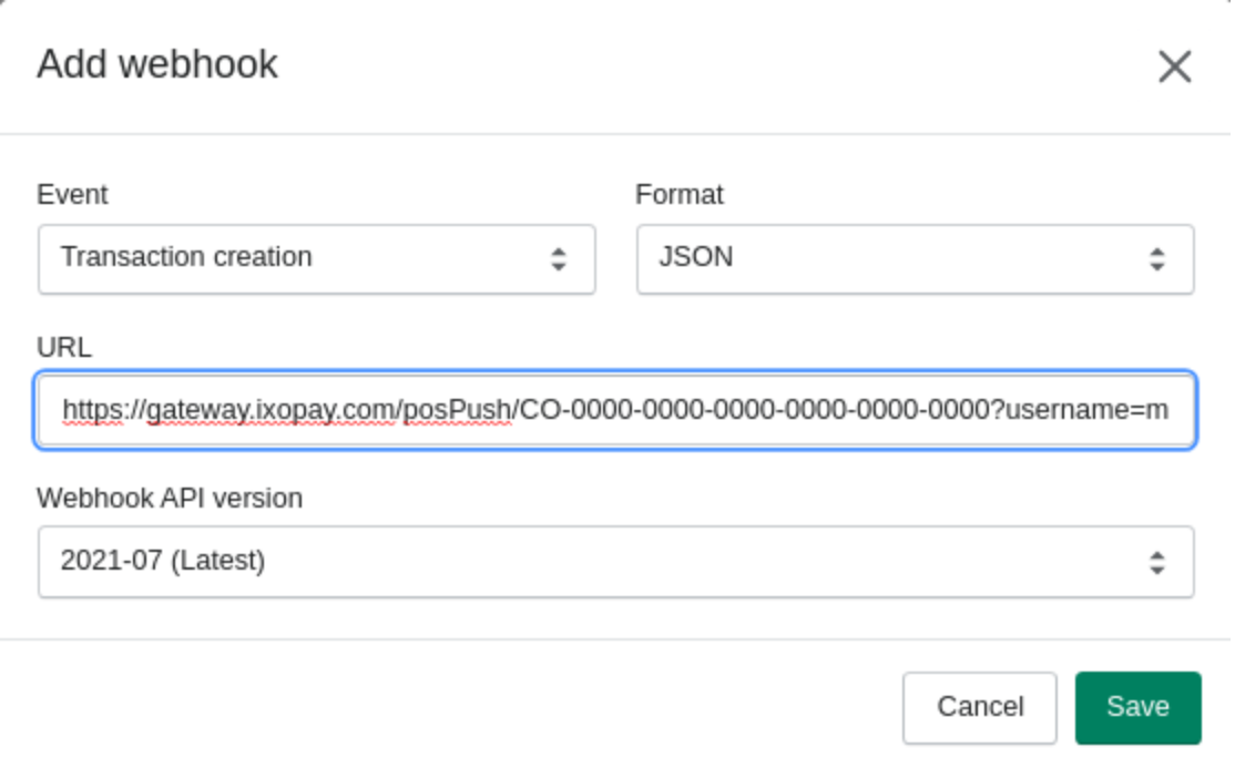 https://gateway.ixopay.com/posPush/CO-0000-0000-0000-0000-0000-0000?username=my-api-user&password=API.userPassword1234Note: if the password contains any special characters, you’ll have to properly encode them. (Image 3)