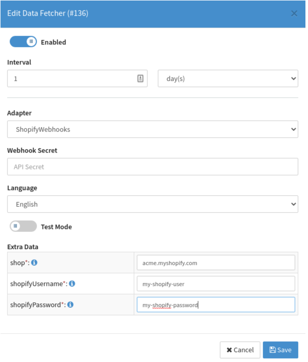 Create a settlement data fetcher by selecting the Shopify Webhooks Adapter and paste the shop’s hostname as well API username and password. The data fetcher will automatically collect the necessary settlement information, provided by Shopify payments. (Image 5)