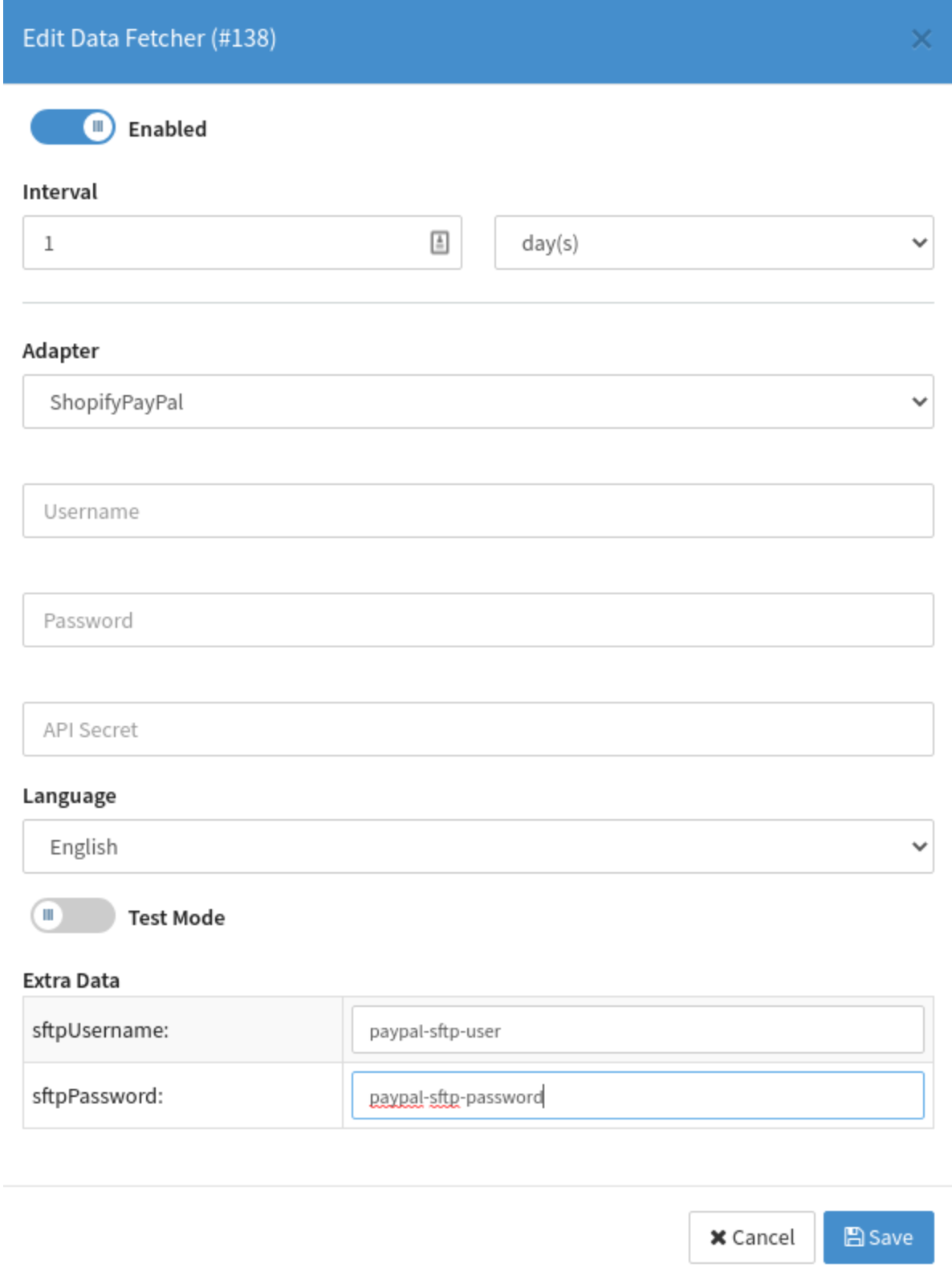 In order to have the IXOPAY platform automatically retrieving and parsing STL files, you'll have to provide an SFTP User within your PayPal’s Merchant Account. For retrieving the SFTP credentials Refer to PayPal’s documentation. Once you have obtained the SFTP access you create a ShopifyPayPal data fetcher. (Image 6)