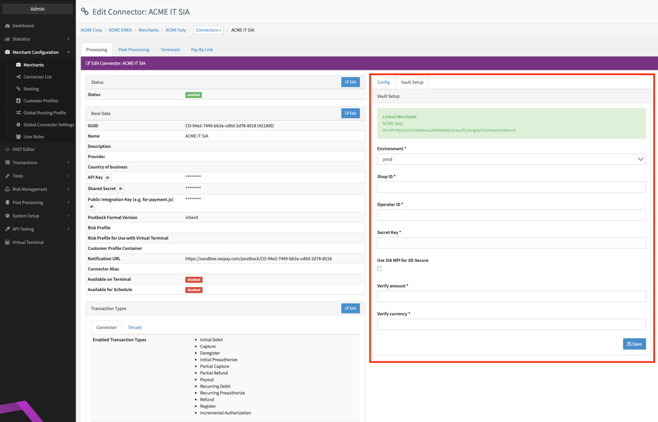 Configure the following parameters for the Connector (see Connector Detail Overview - SIA Creditcard - Vault Configuration):